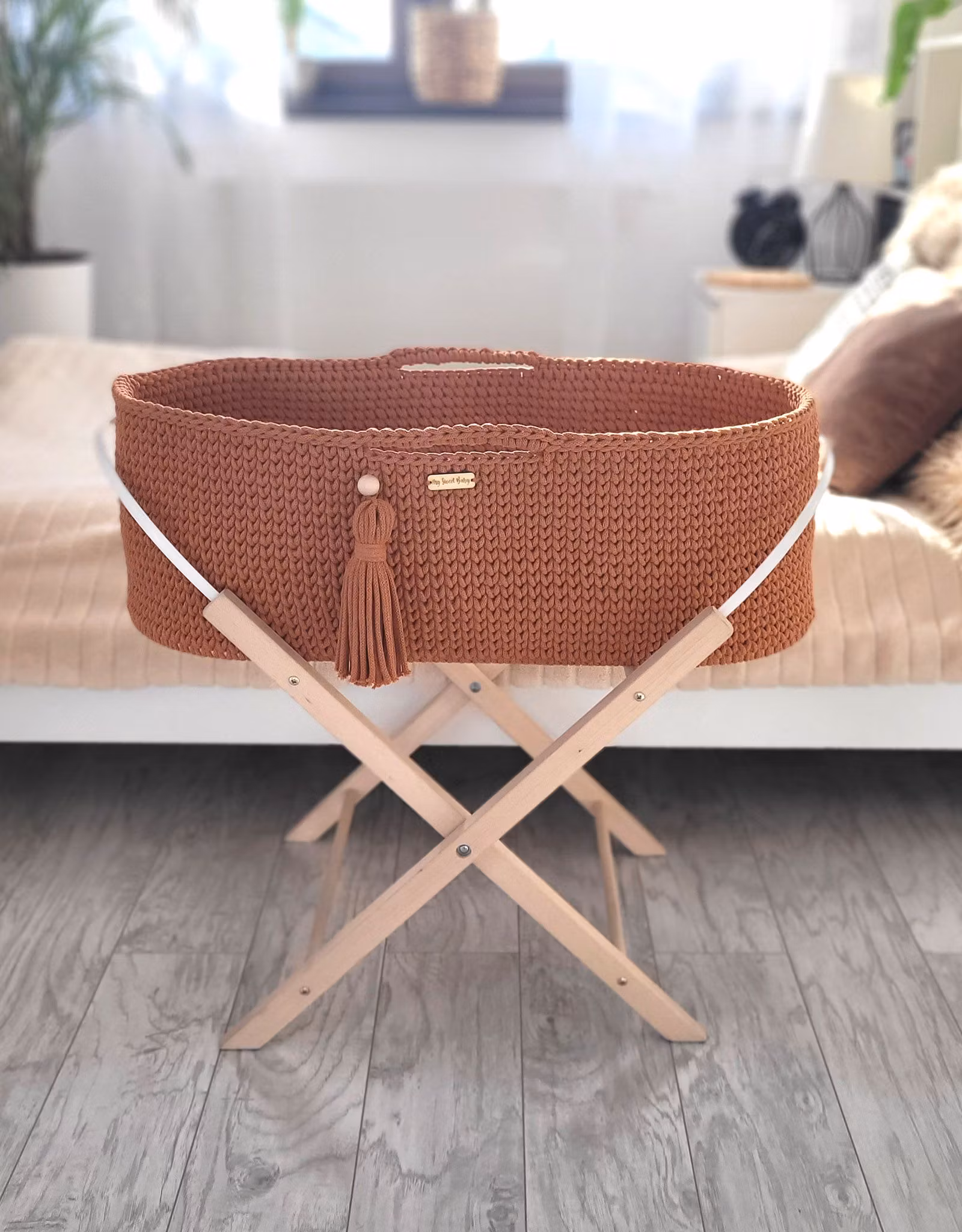 Vacker mosekorg i boho stil. 100% handgjorda med kärlek. Denna fina korg är den perfekta vaggan för ditt nyfödda barn. Sidorna och botten på korgen är mycket stabila. Tack vare de praktiska handtagen kan du enkelt placera korgen var du vill. Den eleganta designen passar in i alla rum!