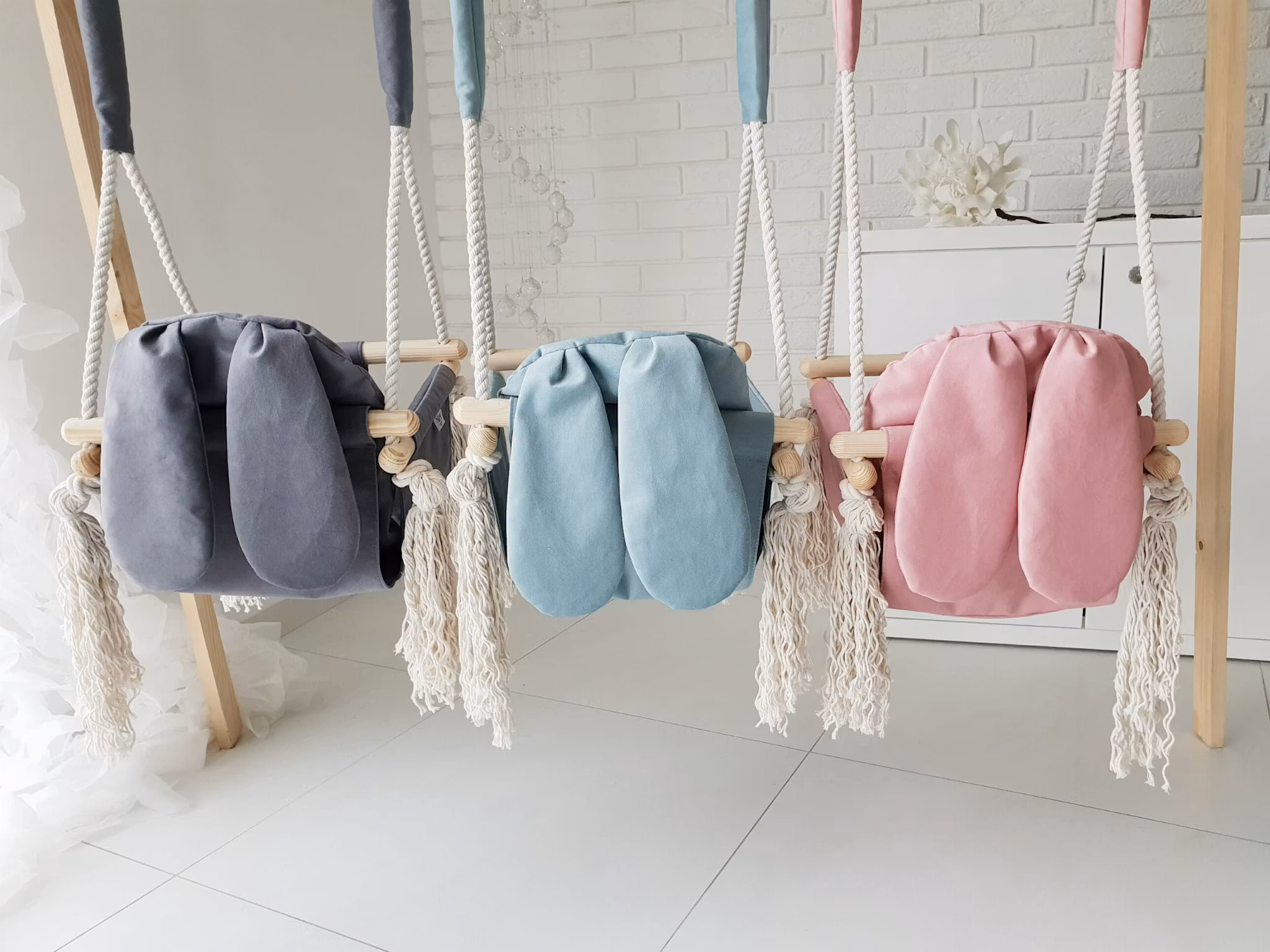 Vacker gunga med kaninöron. Den charmiga designen blir en vacker detalj i ditt barns rum och skapar en varm och inbjudande atmosfär. Tillverkad av högkvalitativa material.